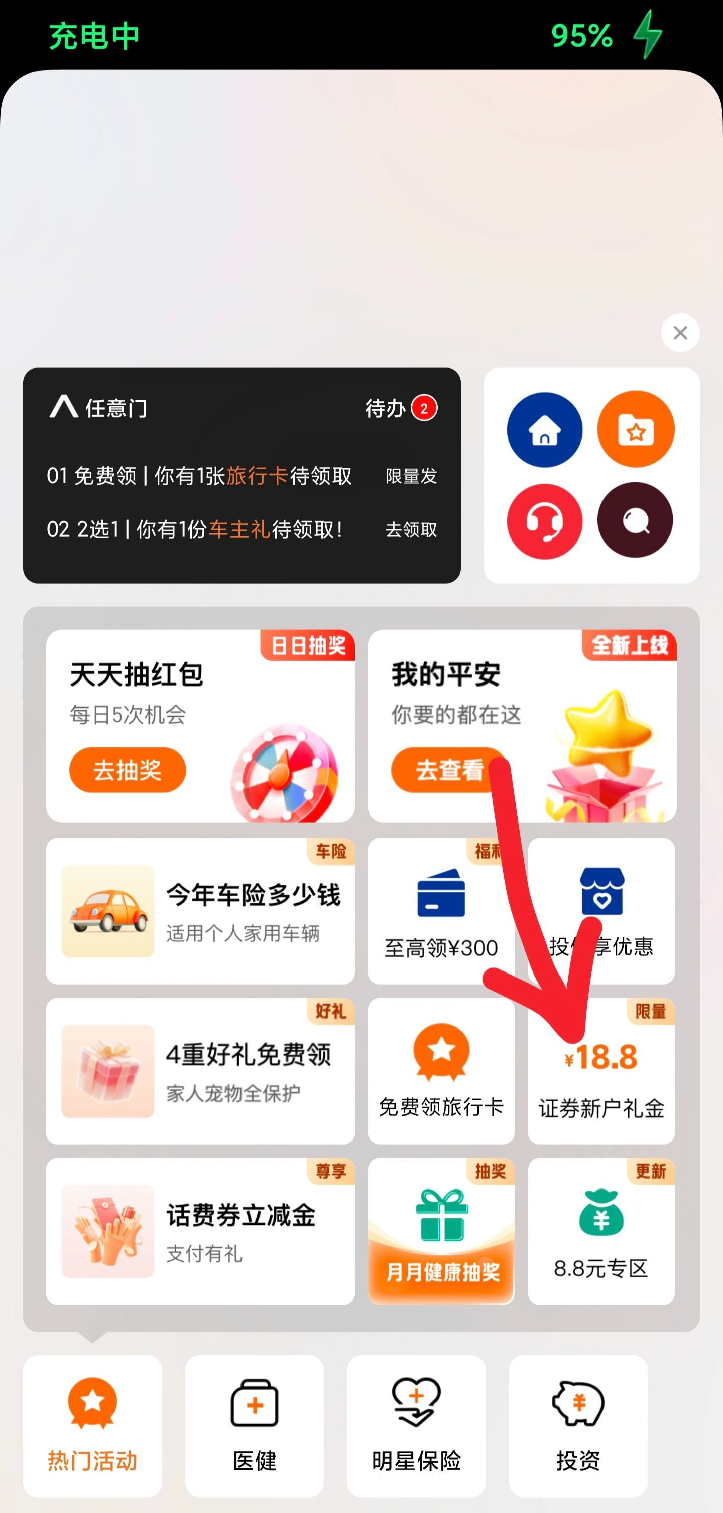 下载平安好车主,如图所示点加号切换旧版,按流程就可以找到新人好礼入口,报名以后去平安证券用报名手机号开户即可,开户很快,真人客服在线验证,回复一个回访短信即可秒开户,然后就能领