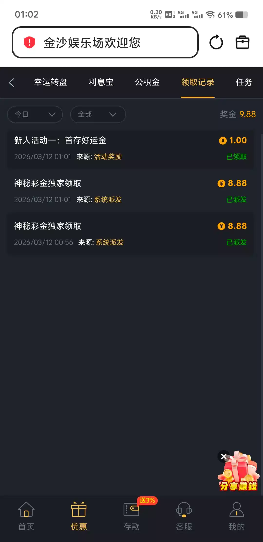 9018回馈8.88,我之前没充值过,领了第一个8.88然后我充了10块又领了一个